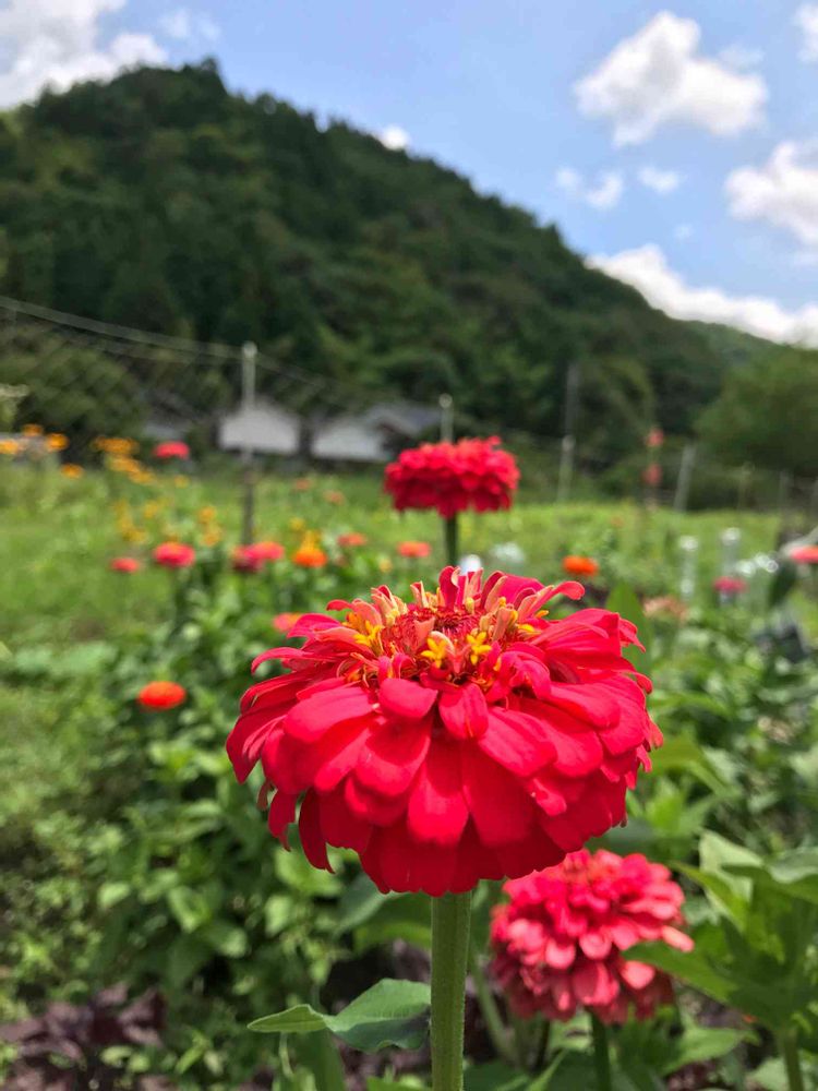 畑で百日草が咲いています