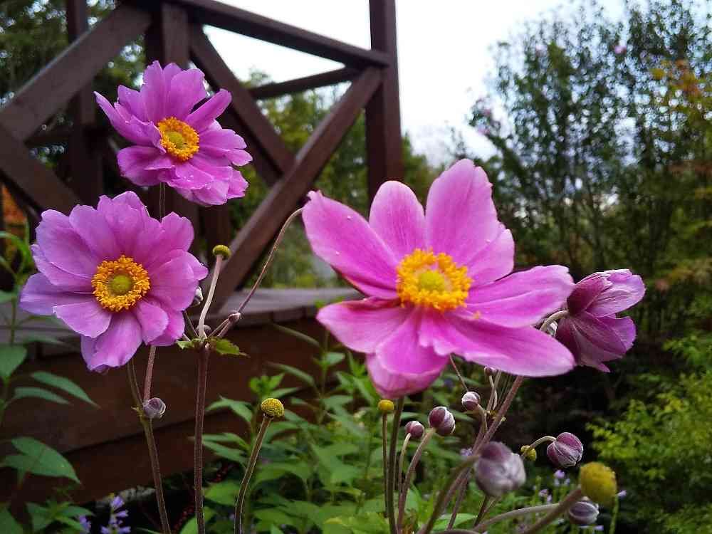 普通に見る秋明菊より花びらの枚数がが多くて八重よりも少ないなんか珍しい秋明菊に見えます。