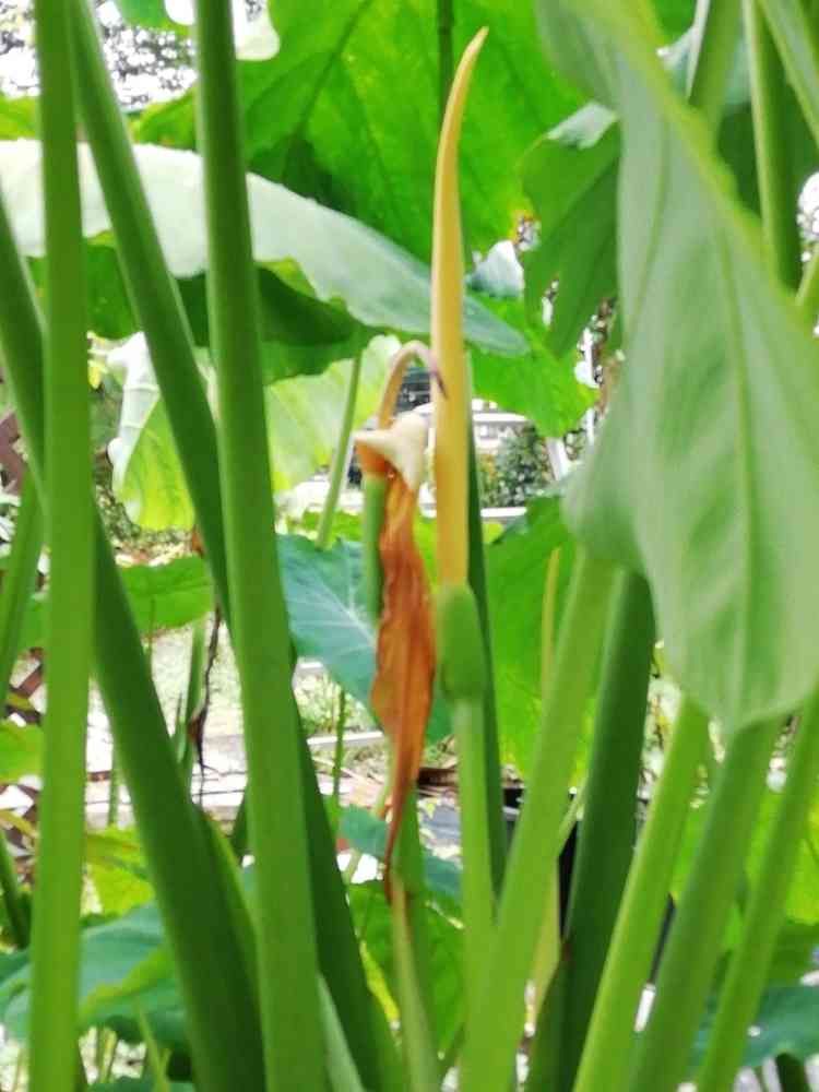 里芋を作って二年目です。今まで里芋は普通にみてましたが花をみたのは初めてで…