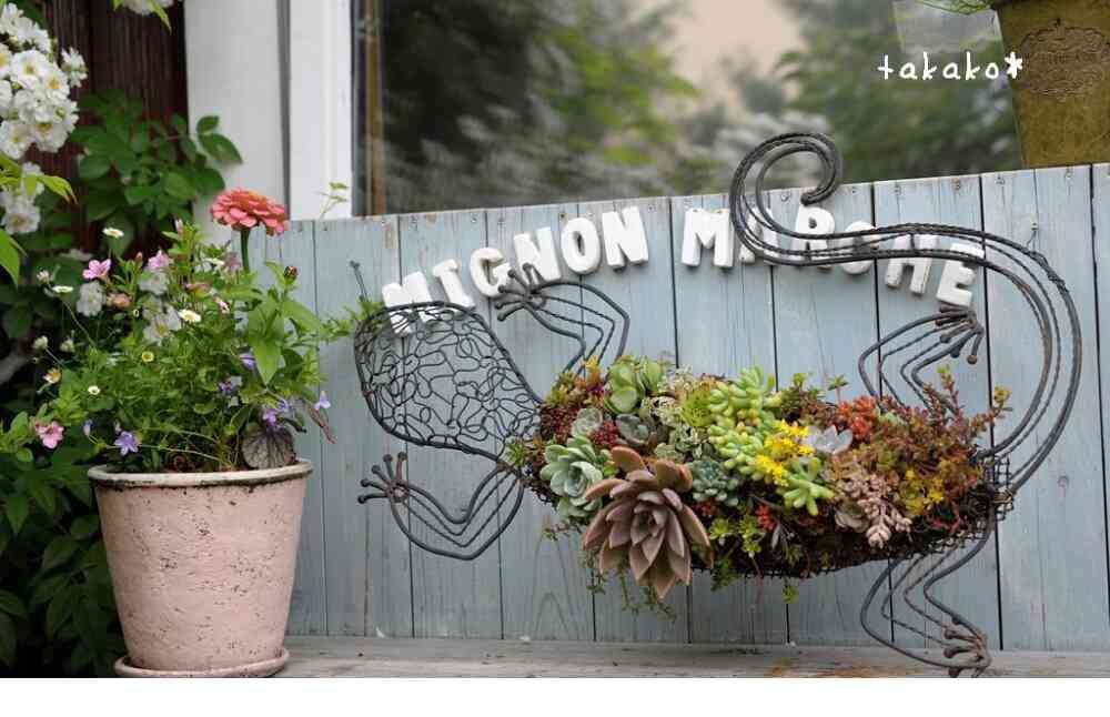 ありがとうございます🎵これは、7年くらい前に講習を受けたときのもので、その時は多肉ではなく色々なグリーンばかりを植え込むというものでした。トカゲは普通の置物だったようですが、先生が背中部分を切り取って植え込めるように加工していました。アイデアですよね!私も気に入っているので、毎年多肉を植えて楽しんでいます🎵