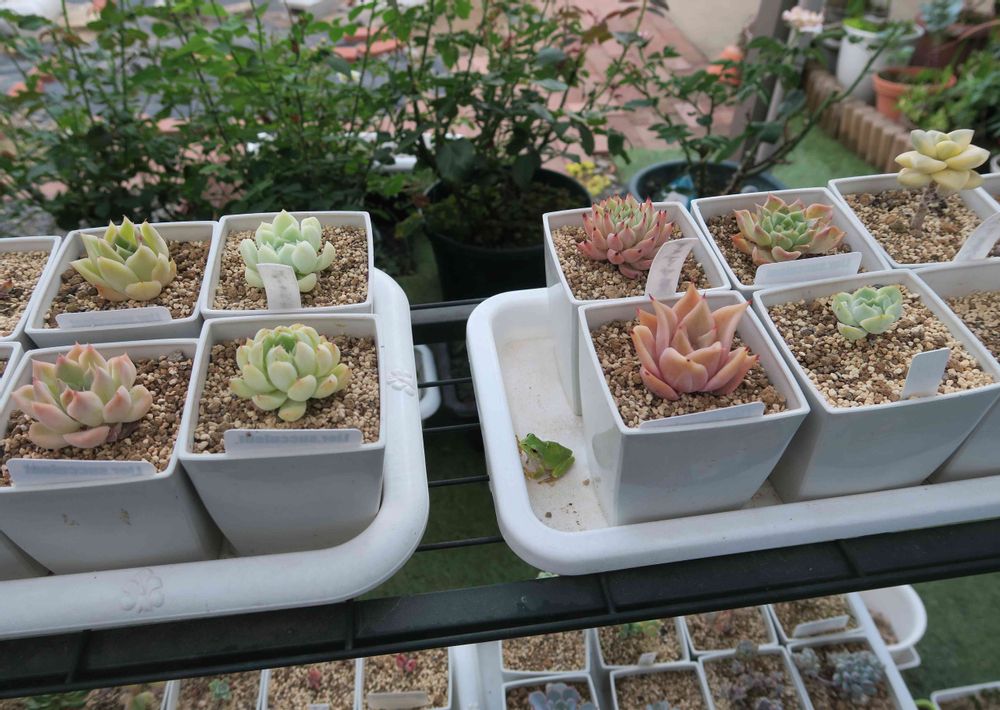 ちなみにpicの小鉢のエケベリアは,左上から時計回りに,ゴールドサンシャイン,ヒューミリス,ザラゴーサ原種,エナメル,アプリコット美人,魅惑の月,マディバ,フゴー,フィオキャン。夏場はほとんど水やりしていないので痩せているけど,いい感じの色を保っている。