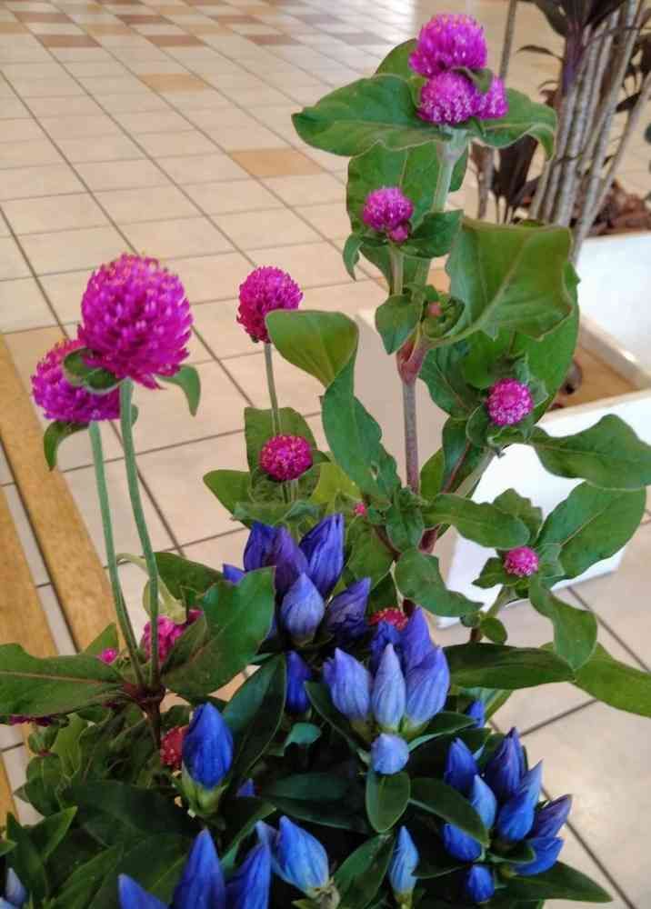 駅ビル花壇のセンニチコウとリンドウの花、素敵です✨✨