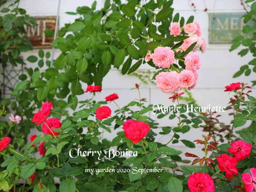 四季咲きのつるバラのマリーヘンリエッテとチェリーボニカです。明るいピンクと赤がお庭を明るくしてくれます(*˘︶˘*).。.:*♡ どちらもとっても病気に強い品種です。