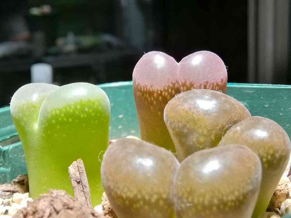 水をあげたらめきめきとふくらんできた品種不明のオフタルモ。奥のピンクのお尻がちょっとかわいい
