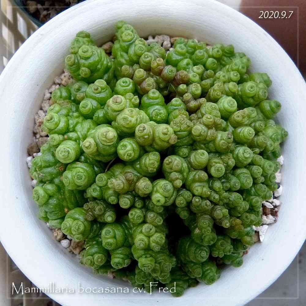 イモムシサボテン、ボカサナ・フレッド。茶色くなってしまっていた部分がやっと緑になった。