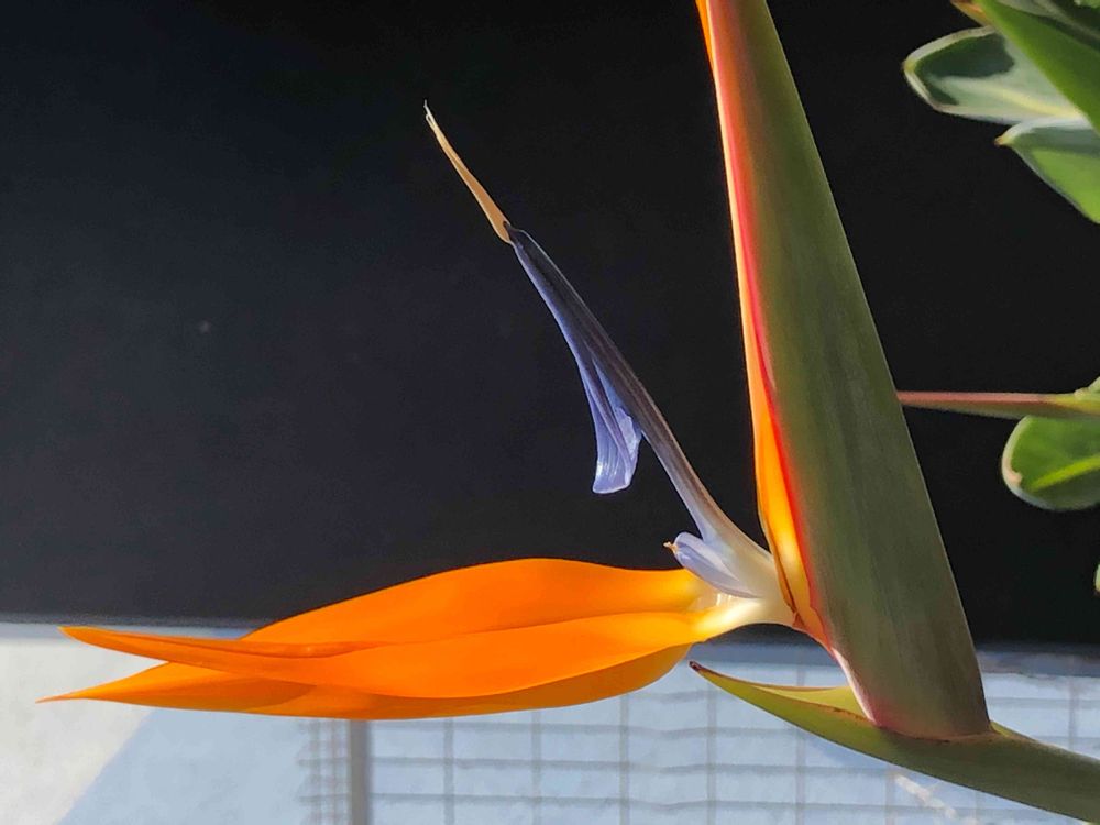 散歩道で珍しい花を見つけました。「ゴクラクチョウカ」(極楽鳥花。別名:ストレリチア)のようです。オレンジ色の翼、ブルーの頭、黄色の嘴をもつ極楽鳥そっくりですね。ゴクラクチョウカ科ゴクラクチョウカ属で、原産地は南アフリカ。