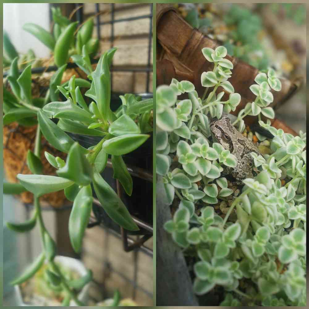 多肉植物食堂さんから買った、多肉サラダ苗セットに入っていた、二節のドルフィンネックレスをポットに置いて土をかぶせて…見事に根付き伸びてきました✨