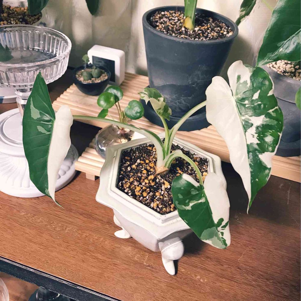順調に綺麗な斑が入っている斑入りクワズイモ、可愛くてたまりません。ほかの鉢は斑を忘れてしまったようです…😢