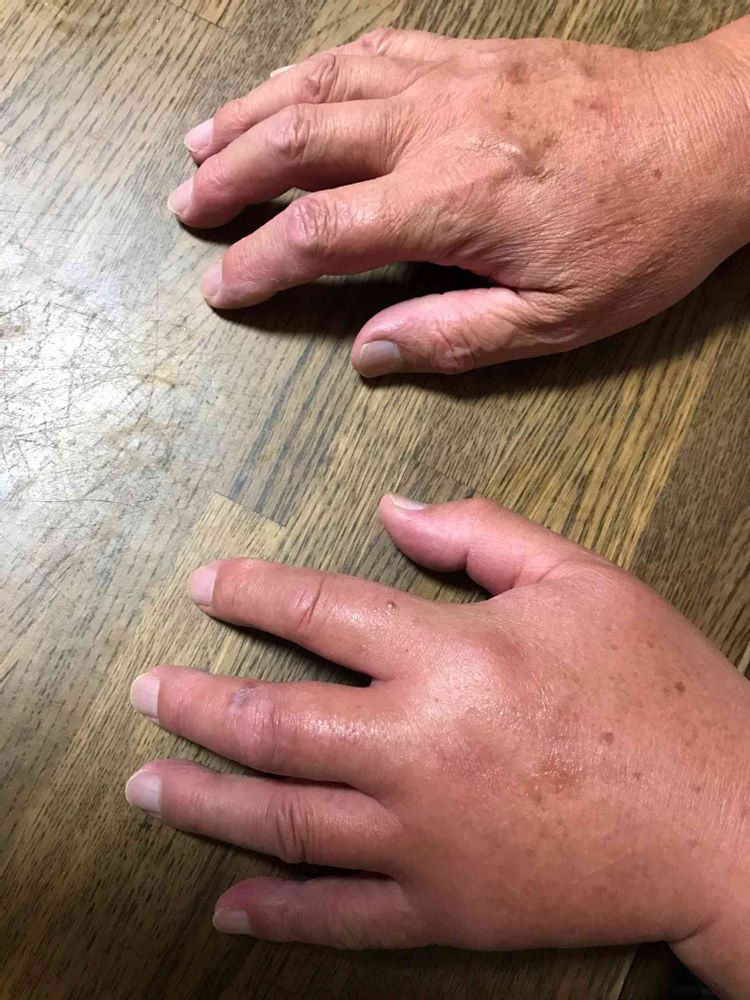 すぐにマニューバ軟膏をつけて痛みは引いたのですが、1日経って左手が腫れ上がってしまいました。