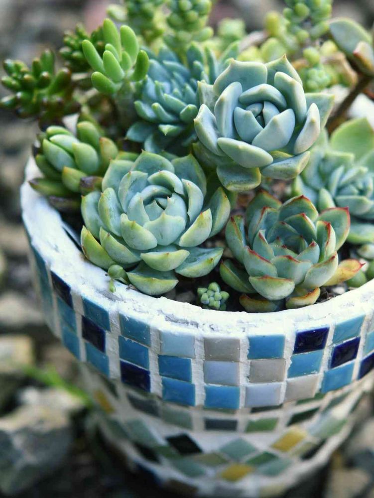 モザイクタイル鉢に寄せ植え。