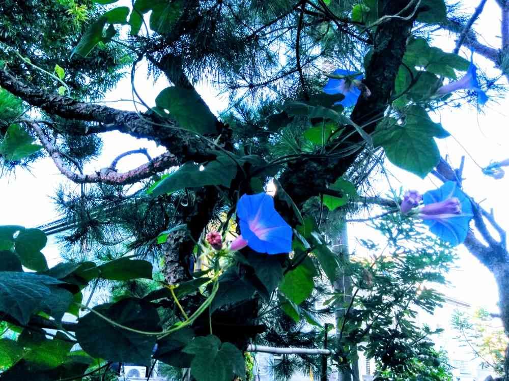 みさと公園から私道へ出て、松の木に朝顔が絡んでいました。