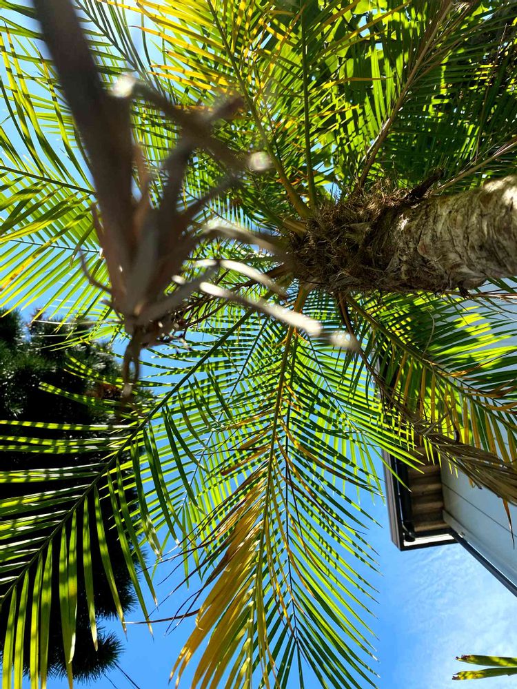 手前に写り込んでるのは枯れ葉です。個人的にヤシは枯れ葉が付いている方が段違いにカッコいいって思います。枯れてる部分があるからこそ生きている部分が際立つといいますか、造形的にも樹冠の下半分が引き締められてよりヤシらしくなると感じます。