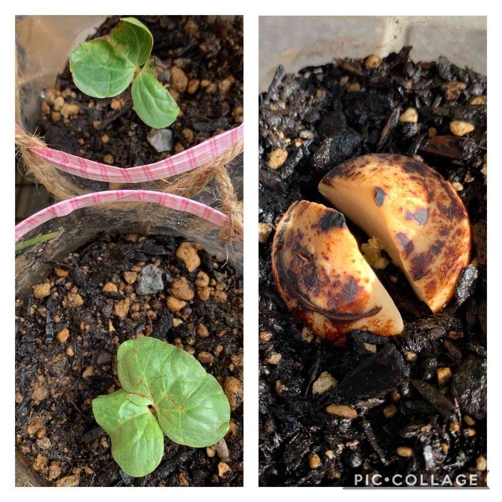 右 アボカド。根はあまり伸びてないけど完全に2つに割れちゃったのでポットに。