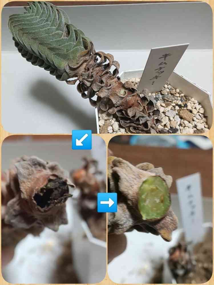 でも、枯れ葉が集中する真ん中辺りをカットすると茎は緑色なのでまだ生き残りそう