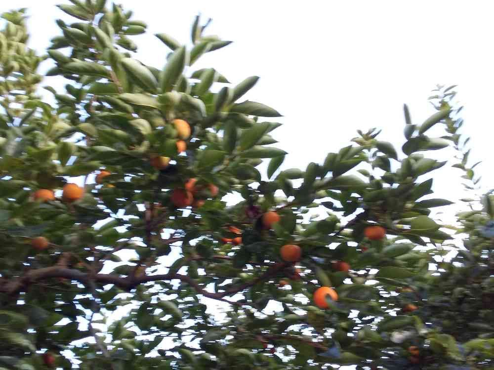 上を見上げたら緑色の葉の中に柿の実が赤く色づいていて奇麗でした。