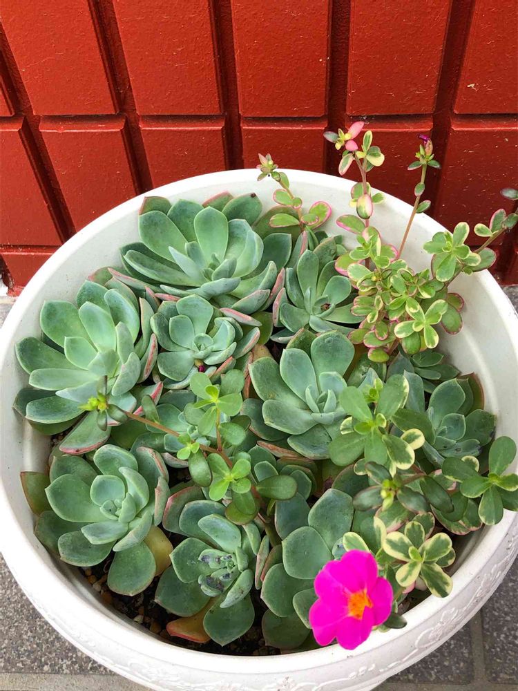 前に投稿した、寄せ植えでスカスカだった多肉さんが、(自然に)ぎゅうぎゅうになり偶然に可愛くなりました💕☺️マジカルキューティーのピンクのお花が映える💕