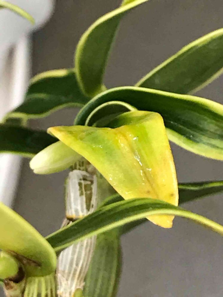 そして葉の様子 黄色っぽい葉の上にある一枚はずっとこんな風に折り畳まれ、反対側に反りかえっています