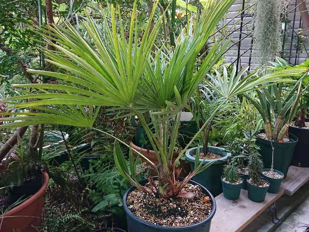 コンパクタは、セリフェラのようにシルバーリーフではないんですが、ザ・緑!のヤシっぽい葉色もそれはそれで魅力的で、しかもあまり大きくなりすぎないという点は、狭小住宅住まいの身には大変ありがたい。根鉢パンパンだったので、ふた回りほど大きな鉢に鉢増し。いやいやホントに楽しみな新人です😆