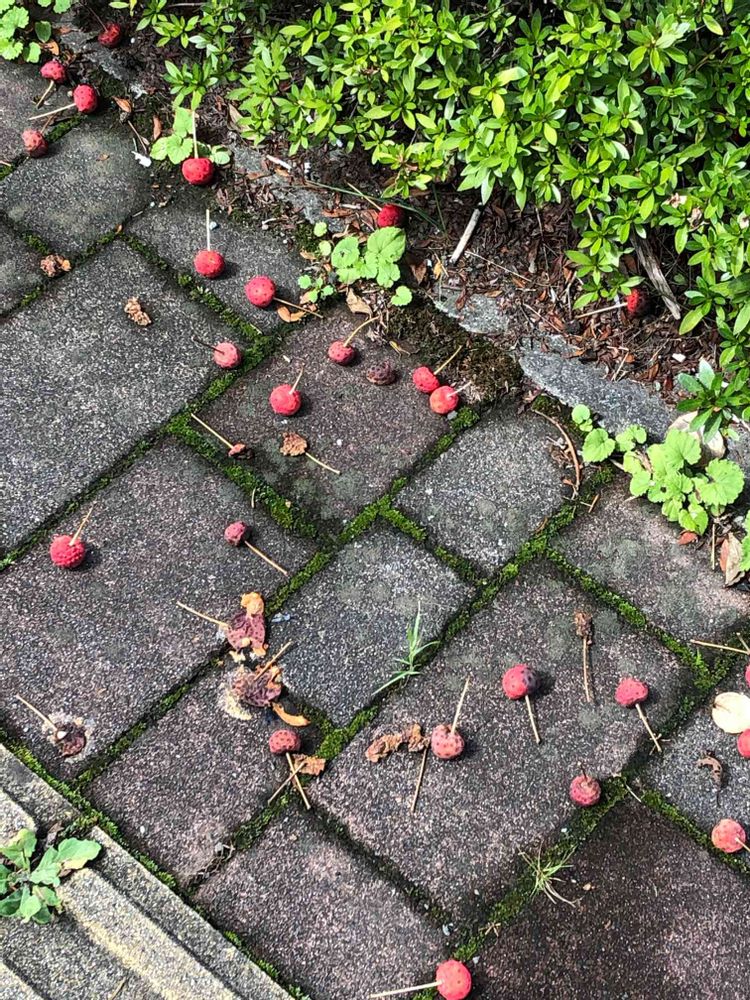 歩道に綺麗な何かの実が一杯落ちていました。上の木の葉を観て気付きました。ヤマボウシの熟した実でした。