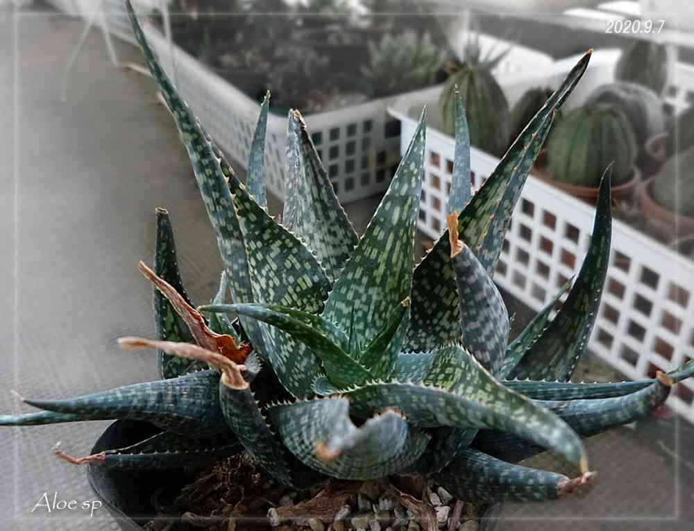 (買ったときから)札落ちアロエ。先月に比べて緑になり、葉先の枯れが進んだような気がする―!