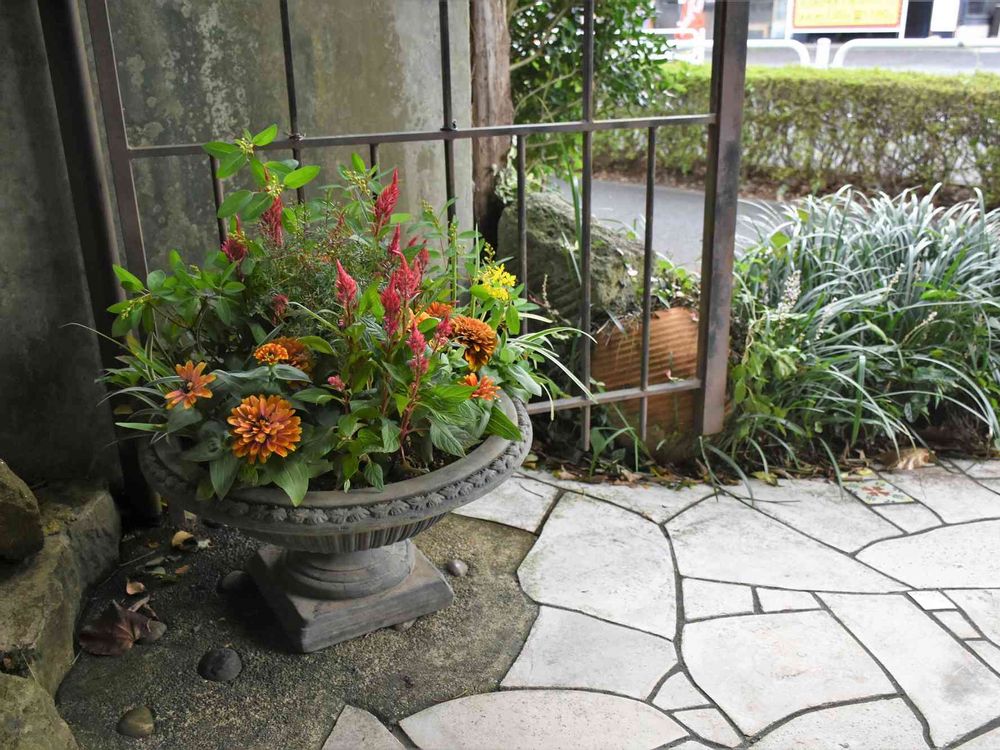 ケイトウとジニア、コウシュンカズラの寄せ植え