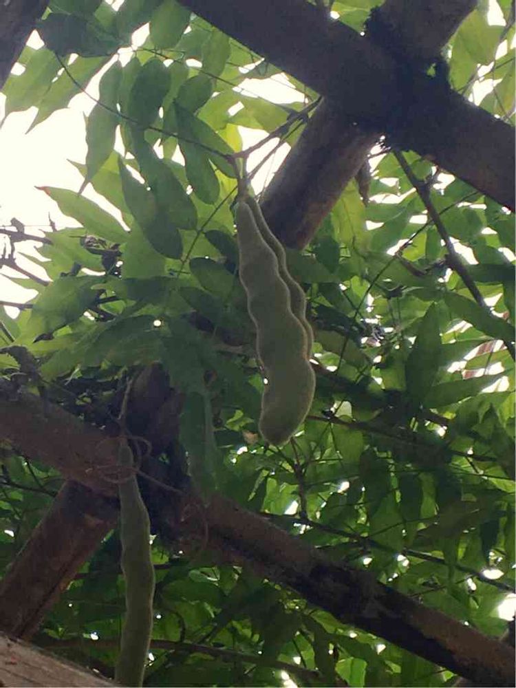藤の花の後さやがブラ〜っと下がってます。硬いです!種がはぜる時はパシッーっと大きな音がするそうです!
