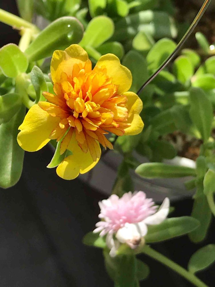 今朝は八重咲きポーチュラカが可愛いく咲いています💕イエローと中心のオレンジ色がほんのり秋色に見えます😊