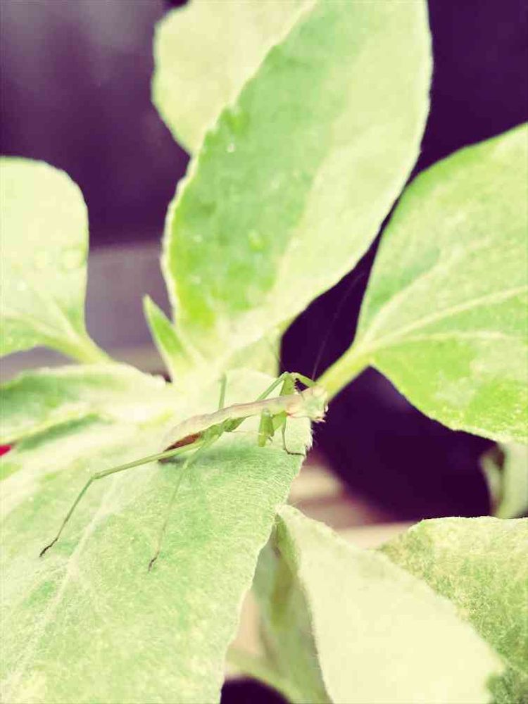 フラワースタンドのどこかの鉢に居て毎日会っているカマキリさん。