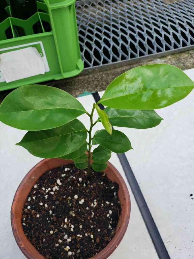 実生のバンレイシ科の何か。二種頼植えた内のどちらかなんだけど、もう少し成長しないと判別は難しいかな。