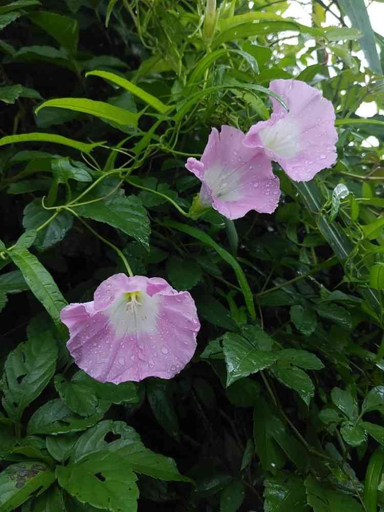 土手道に他の草に絡まりながら、ヒルガオの花が咲いていました。花はよく似ているのに、アサガオは、一年で枯れてしまう「園芸植物」で、ヒルガオは地下茎で増えていく「雑草」…