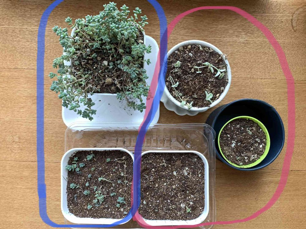 🟦ダシフィルムと🟥リトルミッシー。最初は左上のダシフィルムの鉢にモリモリ一杯、リトルミッシーも同じ大きさの鉢にもりもりいっぱいだったのに…。