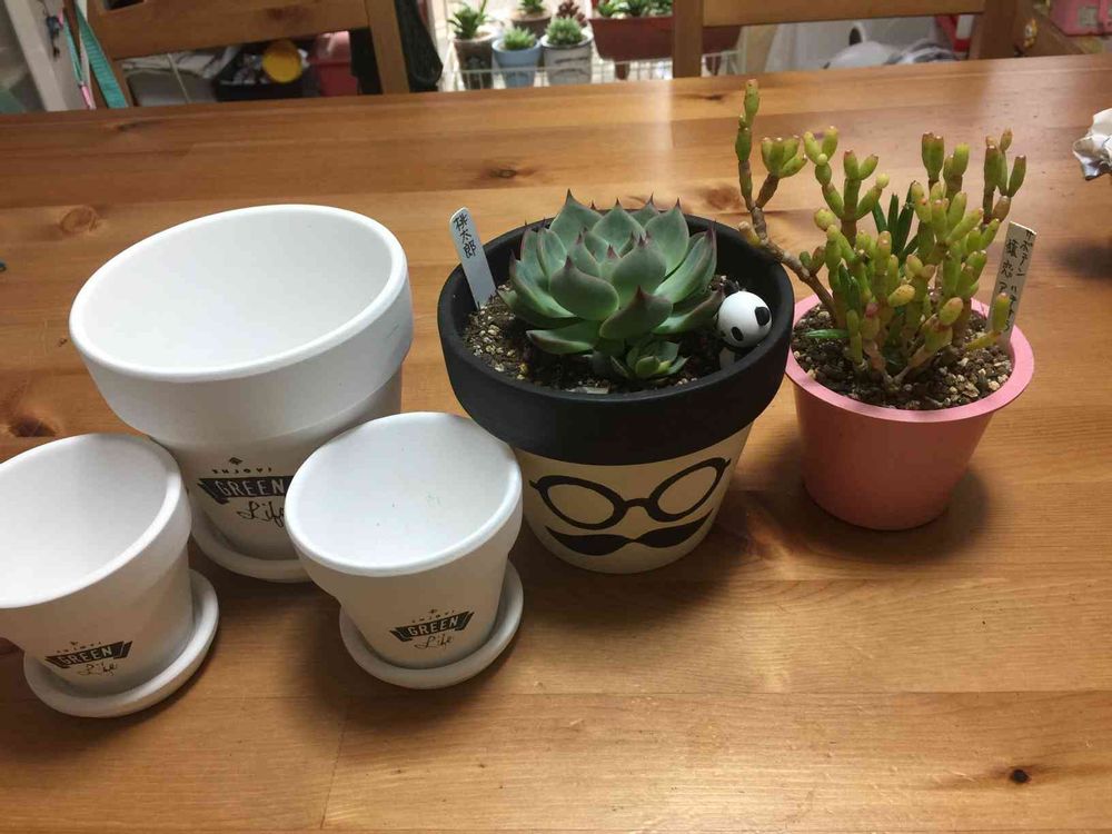 白いリメ鉢は、スリコです!!スリーコインズのリメ鉢😆ずっと売り切れだったから出会えてよかった〜〜!!小さいサイズは150円、大は300円(プラス税)です。受け皿付きは嬉しい😆😂