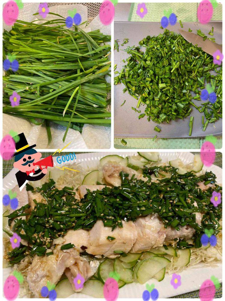 そうですそうです🥰またまたニラが収穫出来たので、ニラのタレ作りましたよー❣️🤗鶏胸肉の蒸し鶏は、主人の大好物です🥰