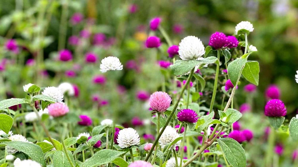 淡いピンクも咲いてコントラストが可愛らしい、朝んぽコースの千日草。