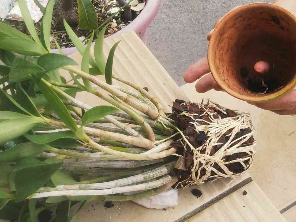 デンドロビウム 縁の植え替え。鉢底に指を入れ上に押しながら外したら指が鉢底の穴にはまってしばらくとれませんでした。家族にウケました😆