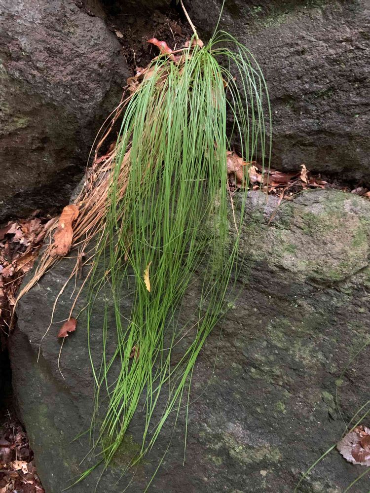 城址の石垣から伸びる緑色の長い髪の毛のようです。