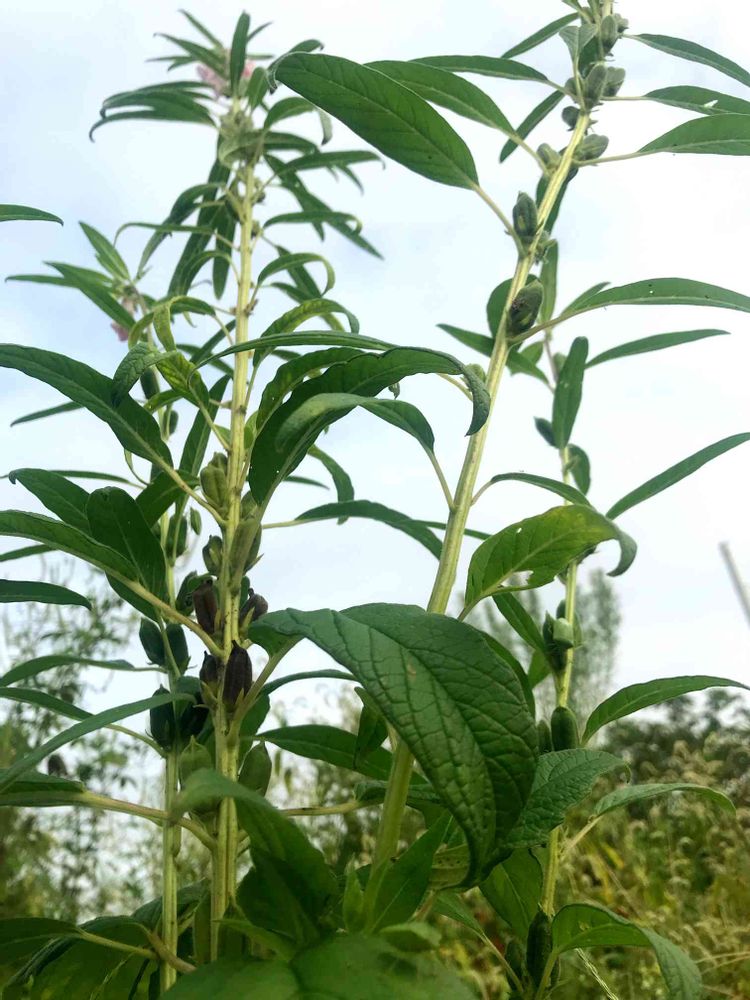 胡麻はまだまだ成長中。上の方には花が咲いています。下の方の実が黒くなってきているので、いつ収穫したらいいのかと考慮中です。