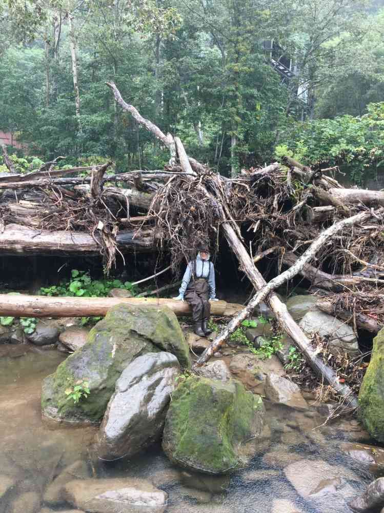 渓流釣り中に雨。数年前の台風の跡で雨宿り。