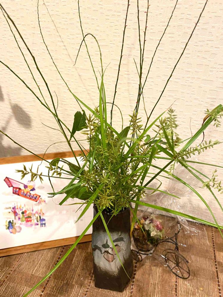 芝生にたくさんカヤツリ草が出てくるのだすが、もったいなくて玄関に飾りました。合わせて水引も一緒に。
