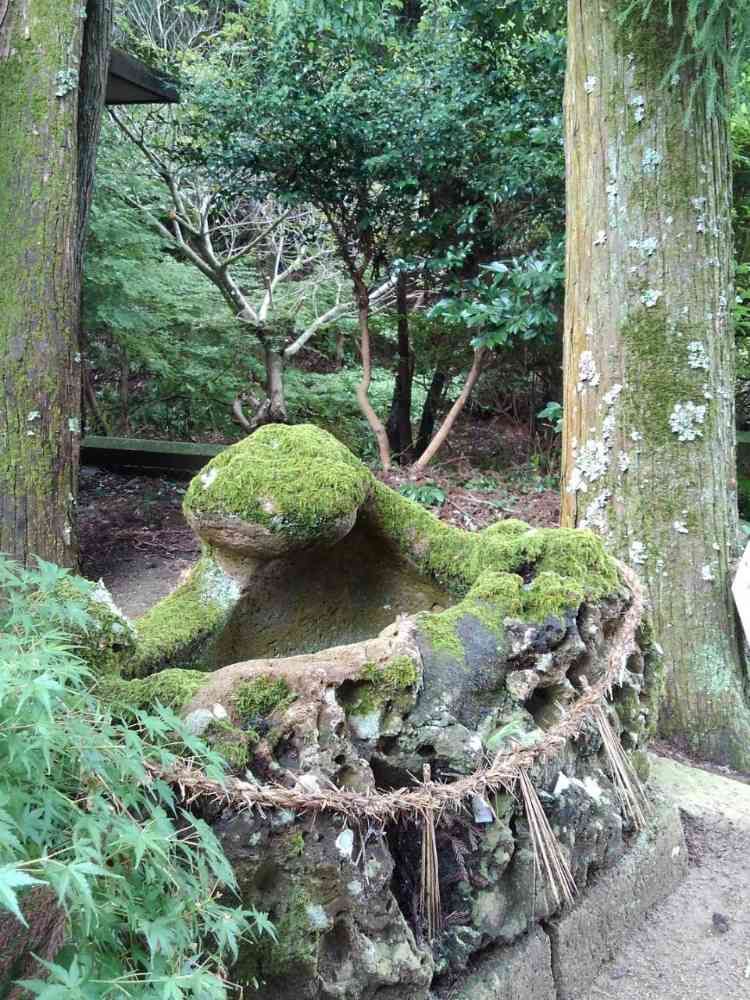 年月で風化し、苔むした手水石が
