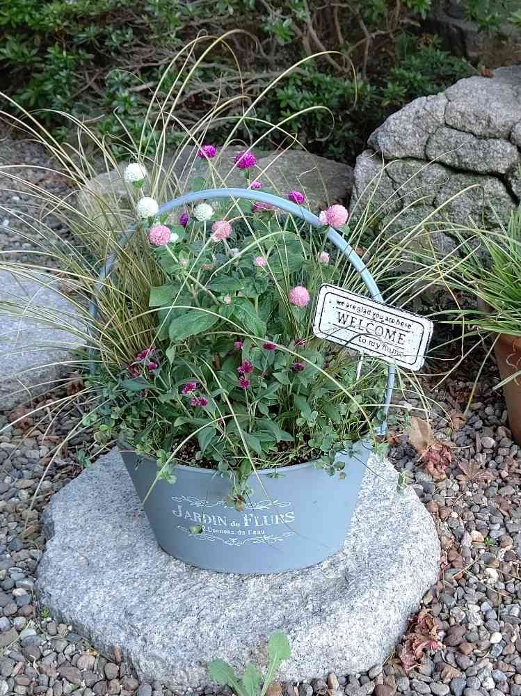 寂しそうに鉢に残されたグラスに手前の小さな花アルテルナンテラポリゲンスをを買い足して、家にあったクローバーとセンニチコウをあしらってみました!