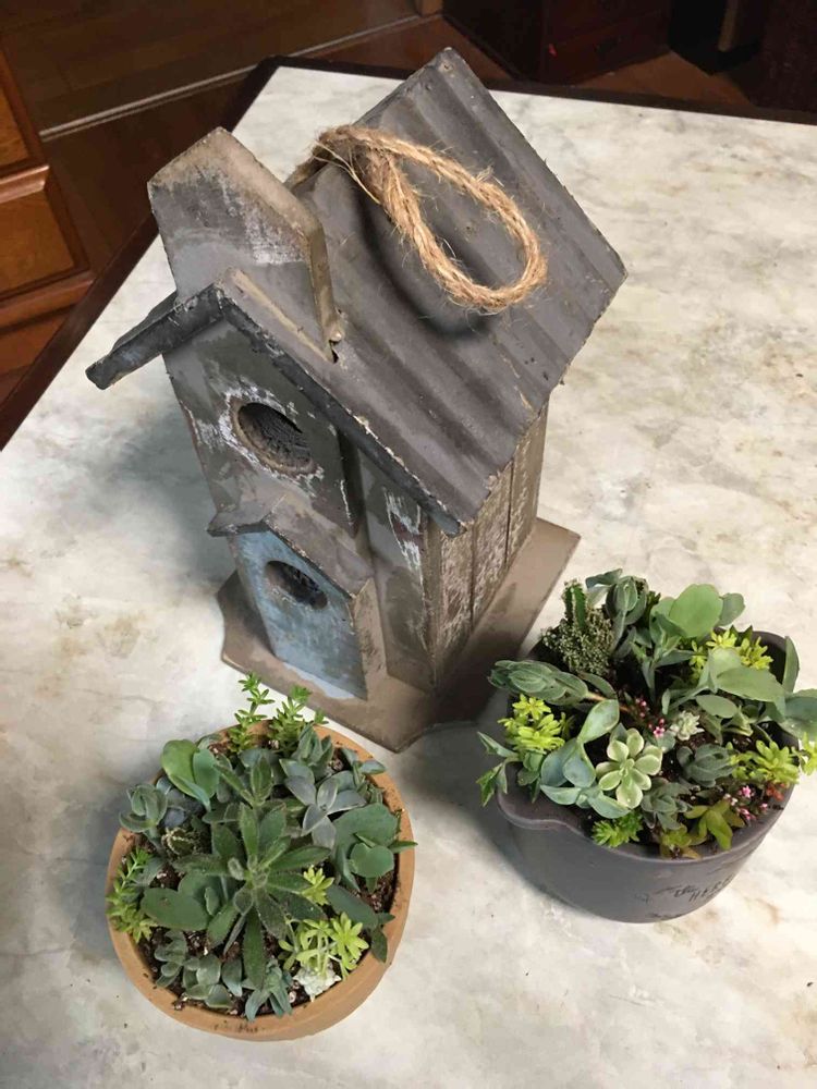 また遊びに来る友人のために、寄せ植え作ってみました‼️同じような写真になってしまうので、買って来て木に取り付ける前の、巣箱と一緒にパチリ‼️