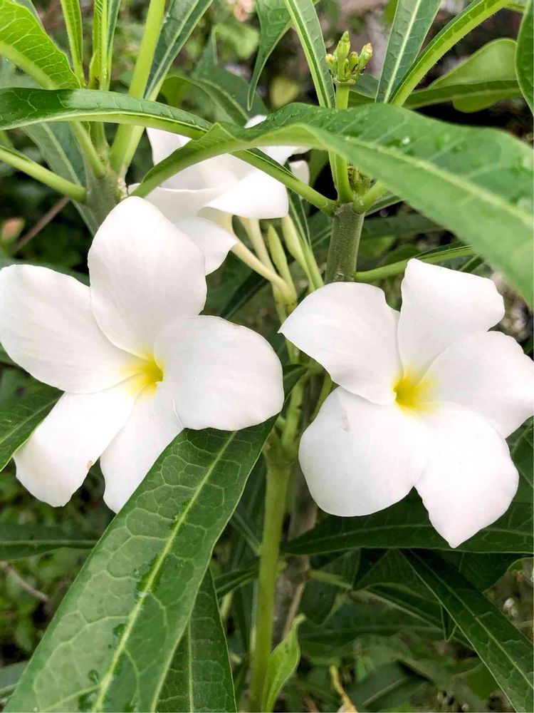 プルメリアの原種系〜との事。普段見慣れてるプルメリアちゃん達より花びら薄くて健気な儚さ増し増し〜♡調べると🔍夾竹桃科だったので掴みはあったなと🧐🎶