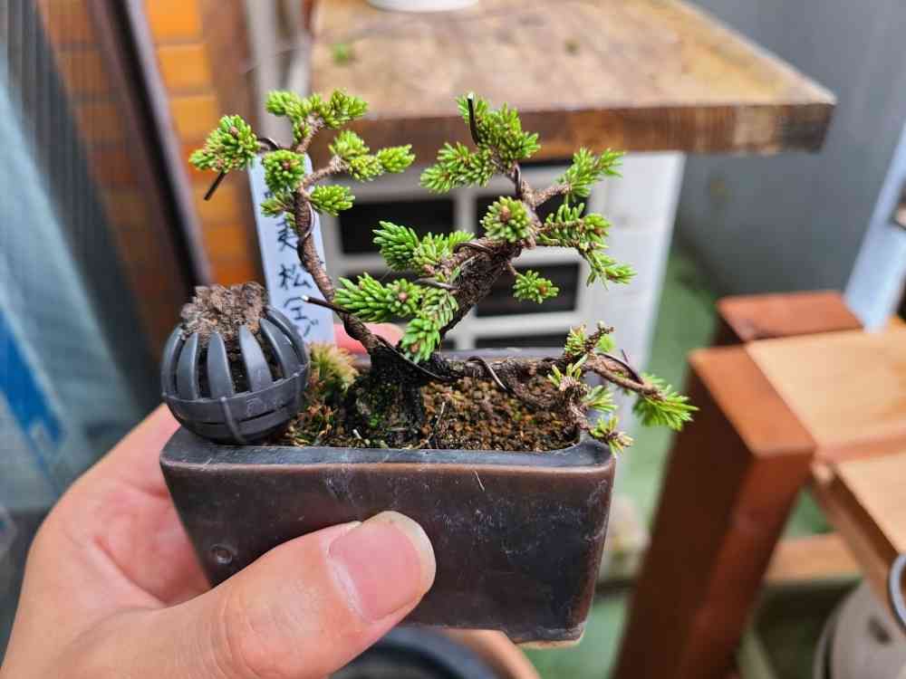 八房蝦夷松。下枝が弱ってるので日が当たるように右上に伸びてた部分カットして芯を建て替え。左の枝とのバランスどうすればいいんだろうなぁ〜🤔