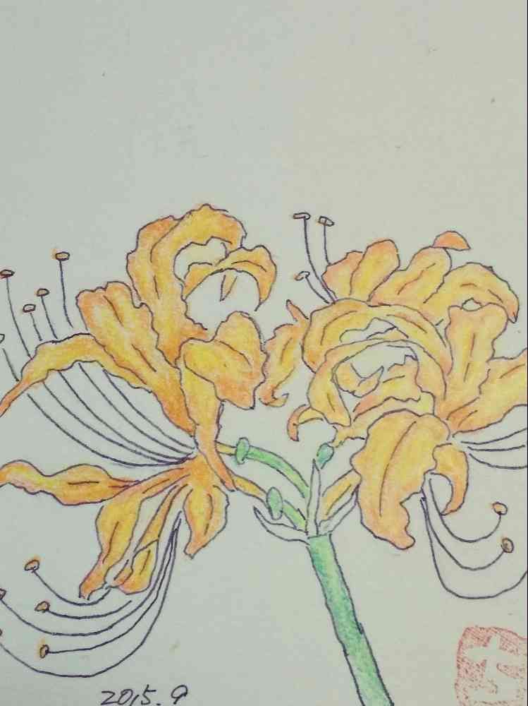 亡くなった義母の忘れ形見です。赤い彼岸花より遅く咲いて義母を思いださせてくれる思い出の花なんです。亡くなって後に描いたもの