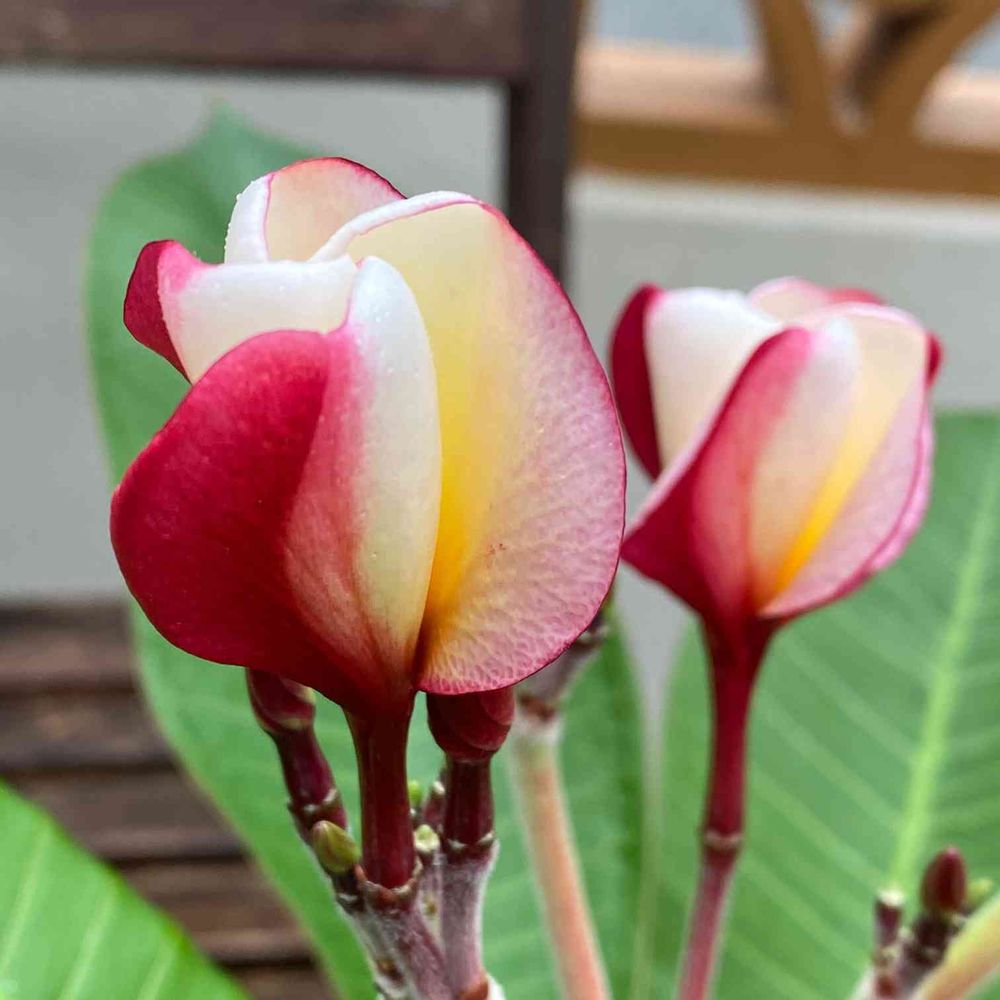 今日は開花間近のプルメリア『JL Church Ruffles』花弁裏に濃い赤のラインが入ります。開花すると花びらの縁がひらひらとした可愛らしい品種です!