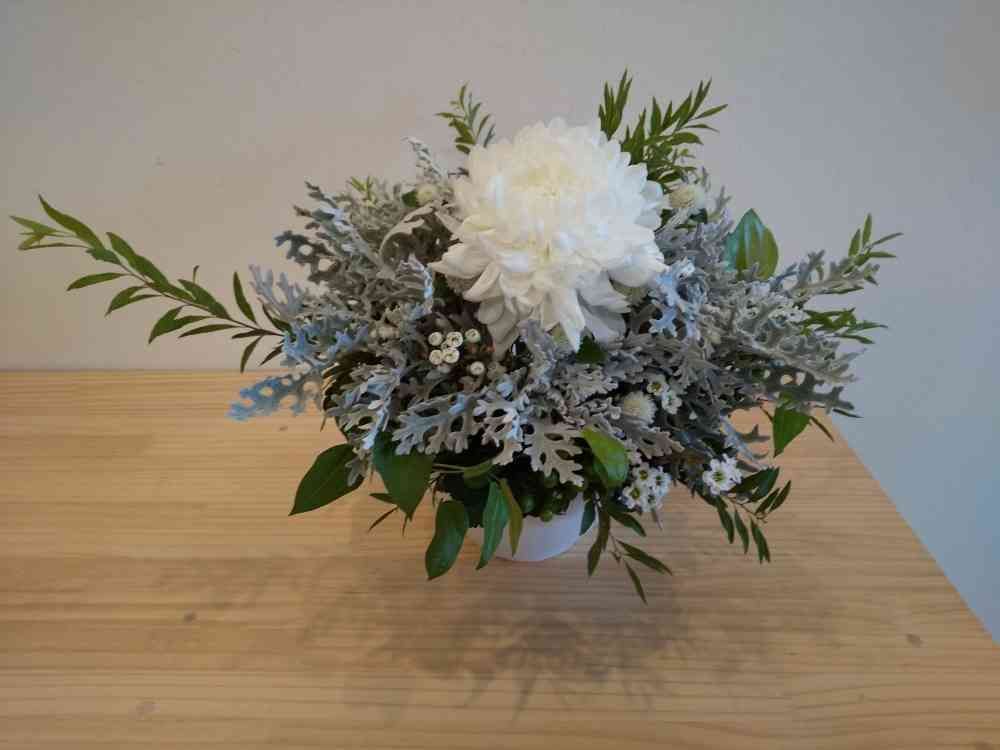 その周りにシロタエギクを挿し、足元隠しにヒペリカムとポリシャスを小分けにして挿しました。