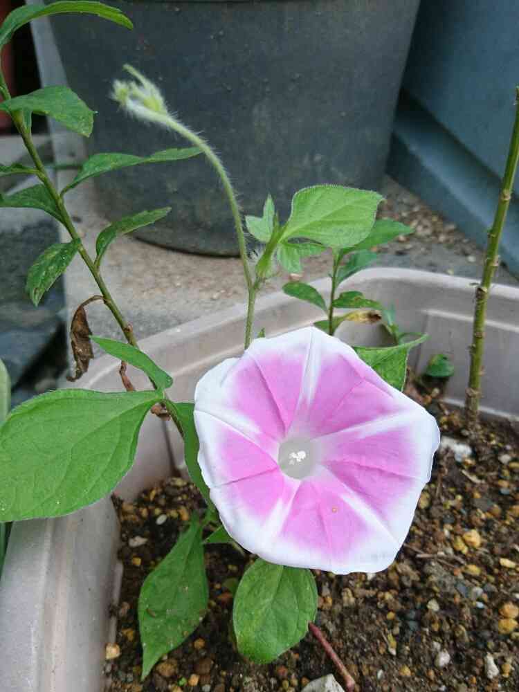 朝顔でしょうか?種を蒔いていないのに庭に小さく咲いていました。今は鉢にあげて成長を見守っていますが、小振りちゃんのままです。葉の形が私が知ってる朝顔のとはちょっと違うような気がして投稿してみることにしました。