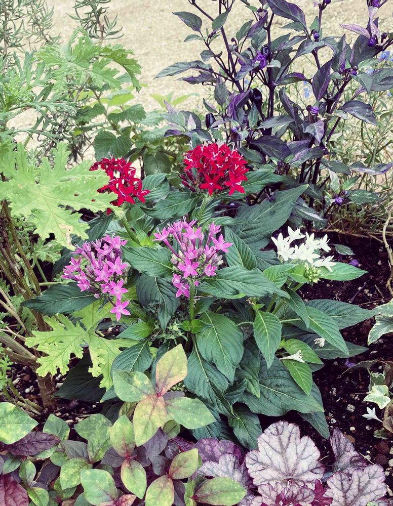 昨日のヒューケラ後方に、ペンタス混色と、紫の唐辛子。
