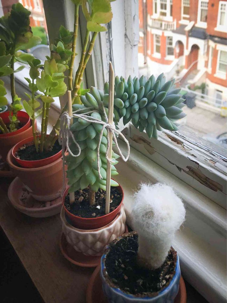 肉がかなり密なエケベリアさん、頭が重い 笑 一生懸命窓の外を観察してるようにも見え、なんとも微笑ましい😆 杖を一本追加してあげたけど、これからどこまで成長するか🌵